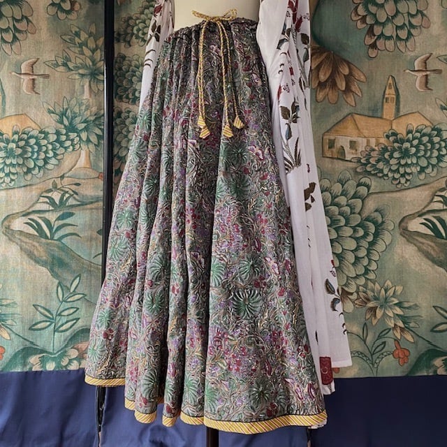 ブロックプリント生地を50枚はぎ合わせたドラマチックなフルサークルスカートです。