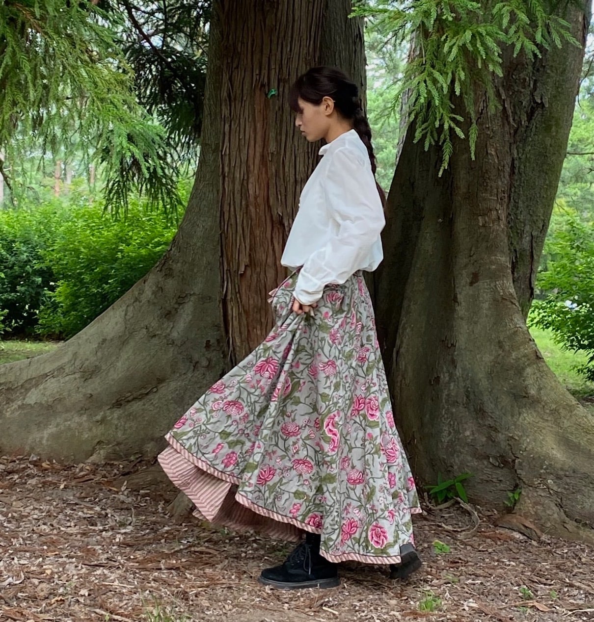 ブロックプリント生地を50枚はぎ合わせたドラマチックなフルサークルスカートです。