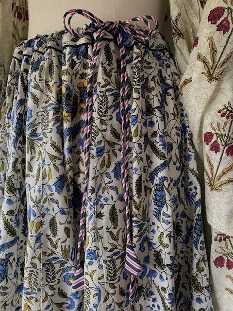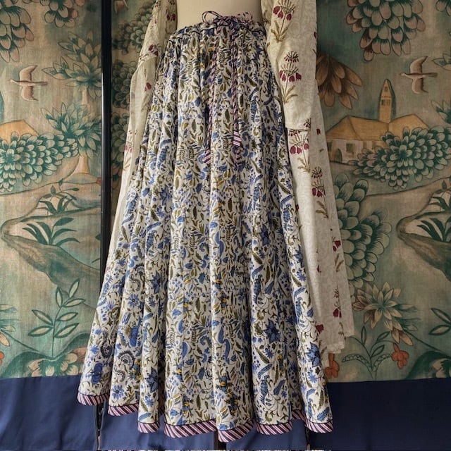 ブロックプリント生地を50枚はぎ合わせたドラマチックなフルサークルスカートです。