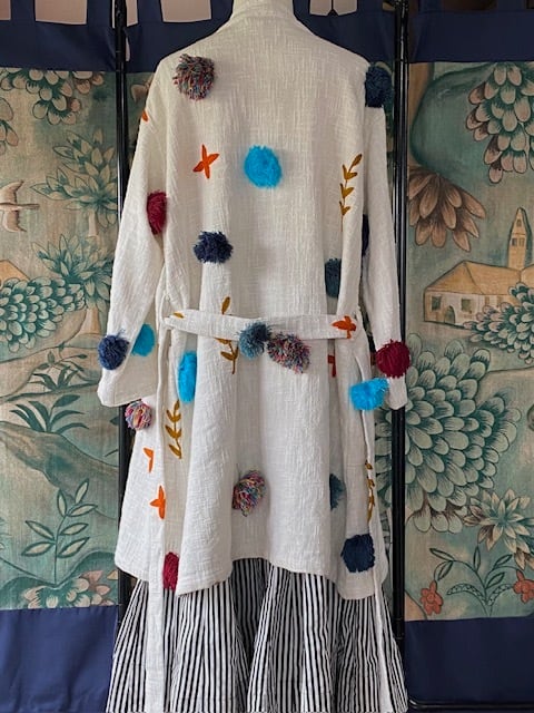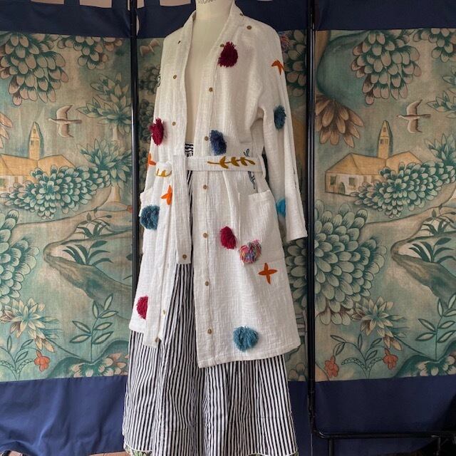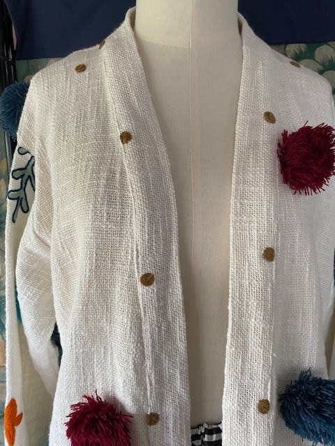 ポップな刺繍とポンポンがランダムに散りばめられていて個性的でカジュアルな雰囲気です。
