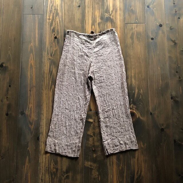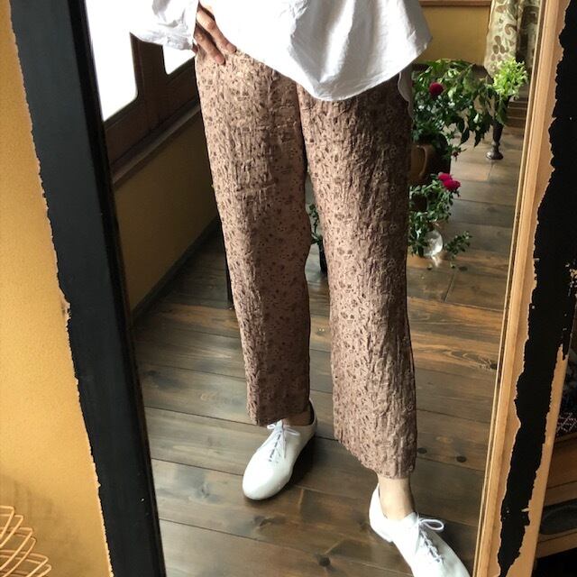 金糸の織り込まれた少し重厚感のある、しっとりとした落ち感の生地が魅力的なパンツです。