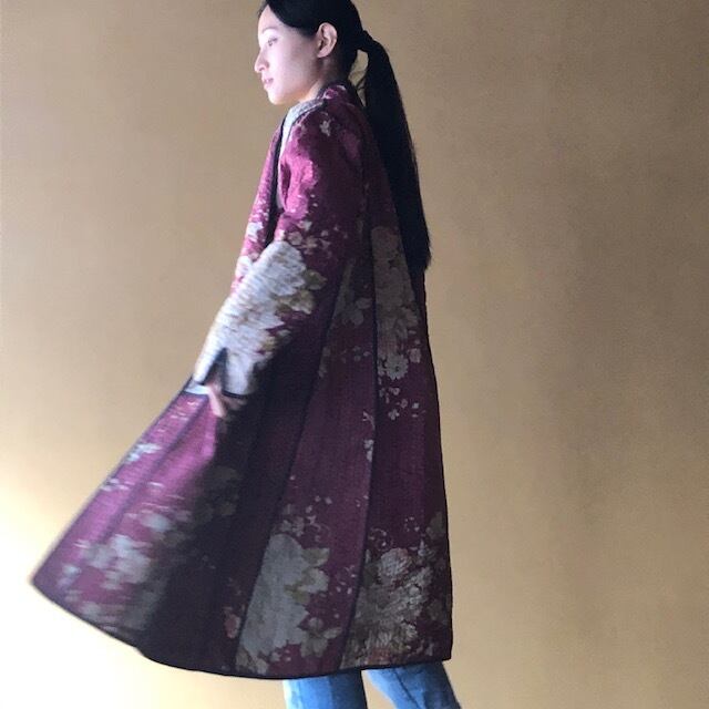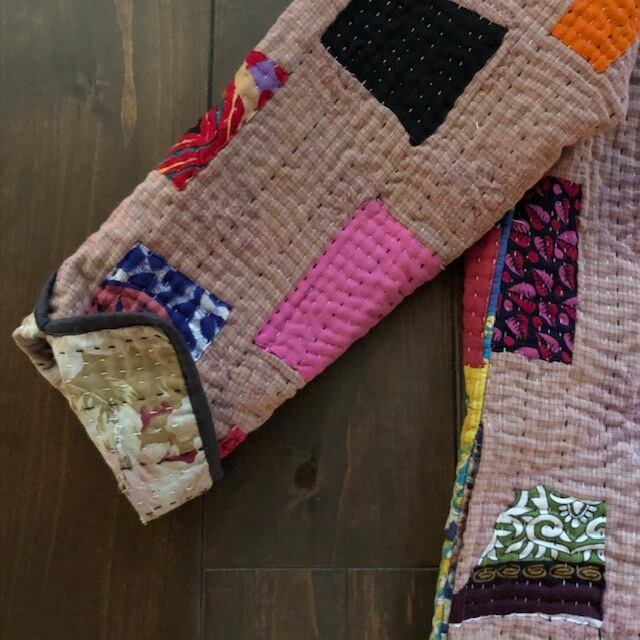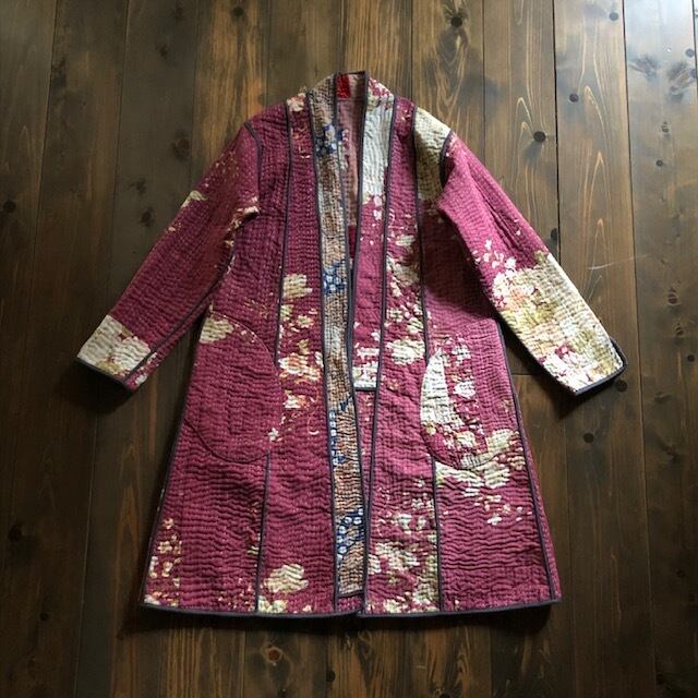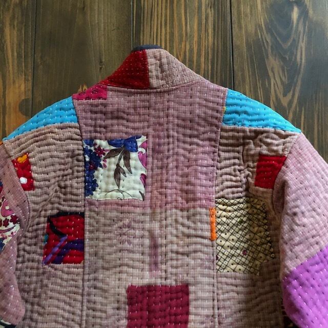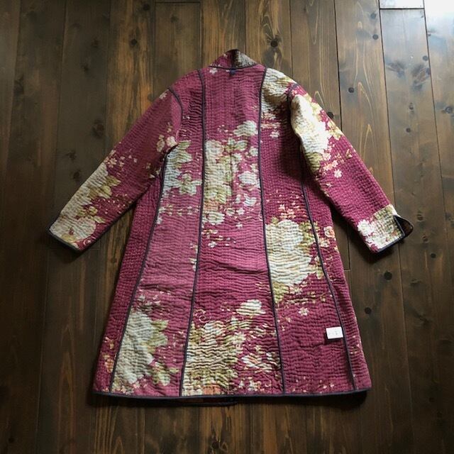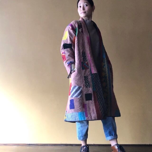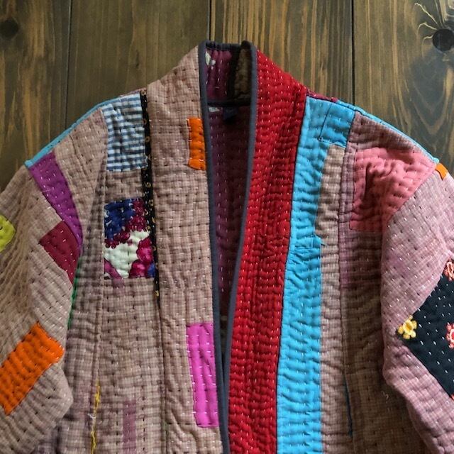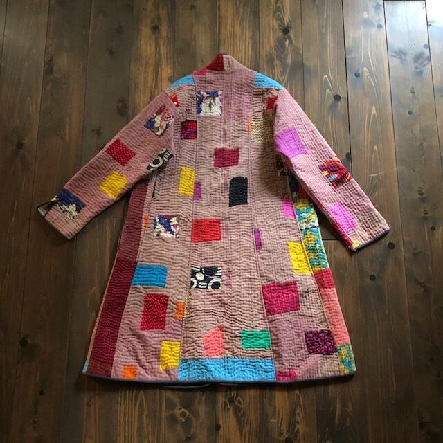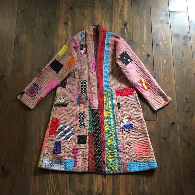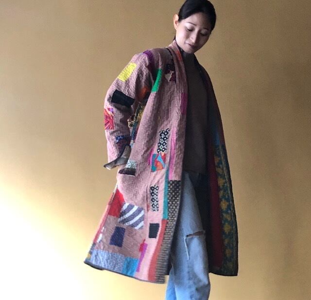伝統的なハンドステッチ、カンタ刺繍が施された風合いのある時を経た生地が、職人さんの自由な発想と感性によってパッチワークされた11枚はぎのコートです。