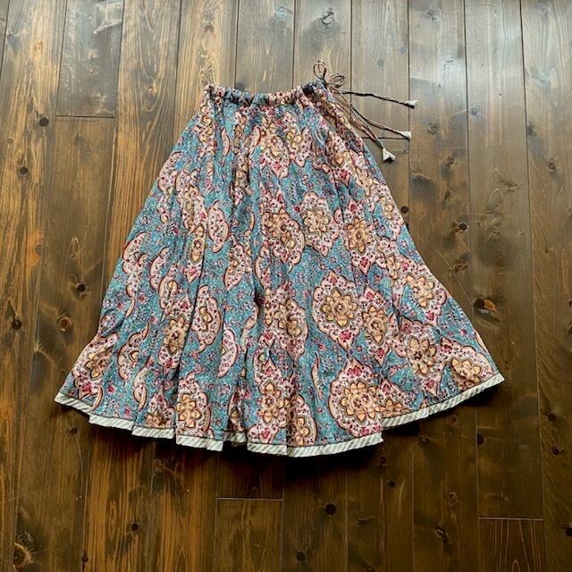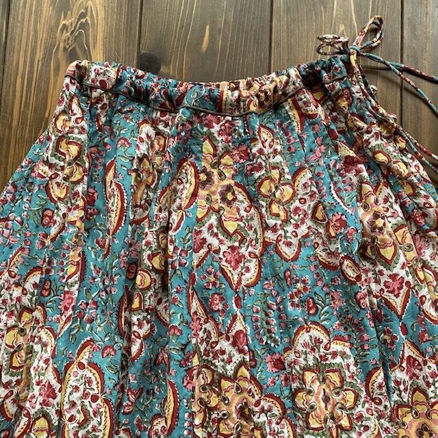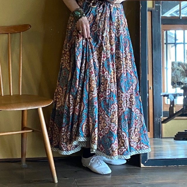 ブロックプリント生地を50枚はぎ合わせたドラマチックなフルサークルスカートです。