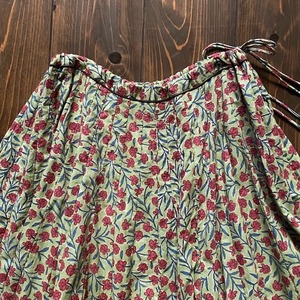 ウエスト脇はくるみボタンを留めていただいたうえ、ヒモで結ぶデザインとなっています。