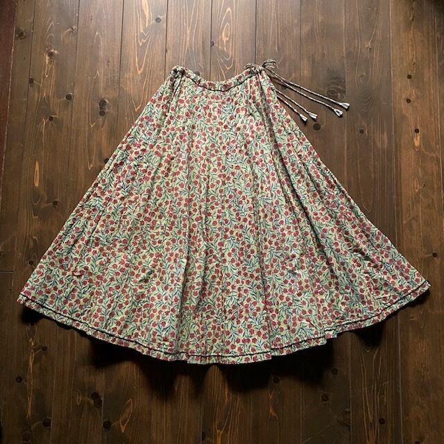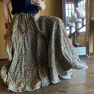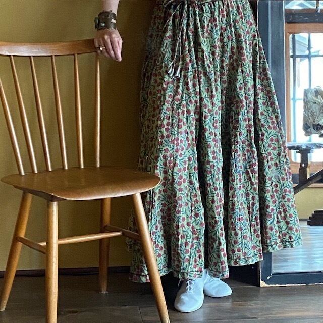 ブロックプリント生地を50枚はぎ合わせたドラマチックなフルサークルスカートです。