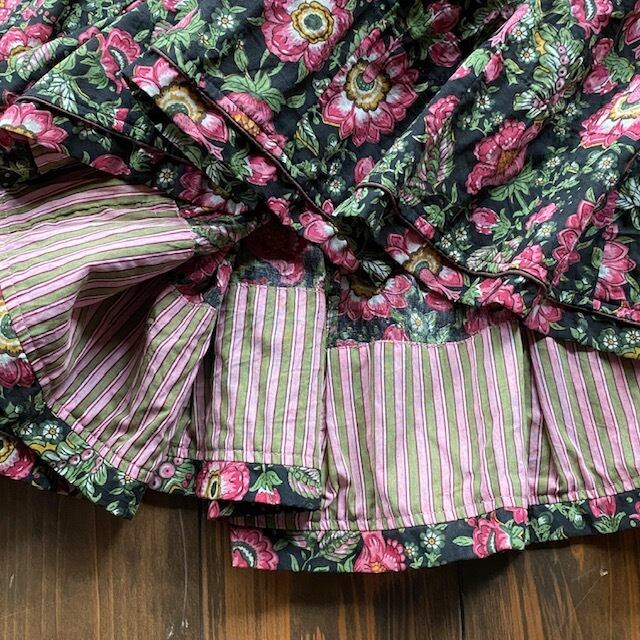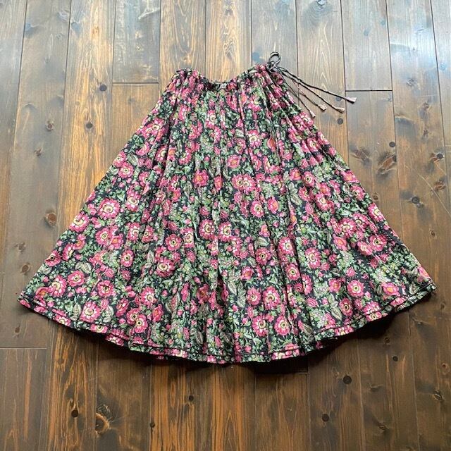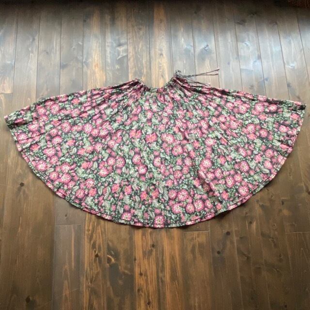 ブロックプリント生地を50枚はぎ合わせたドラマチックなフルサークルスカートです。