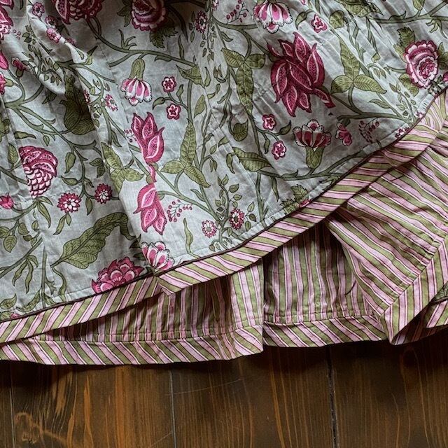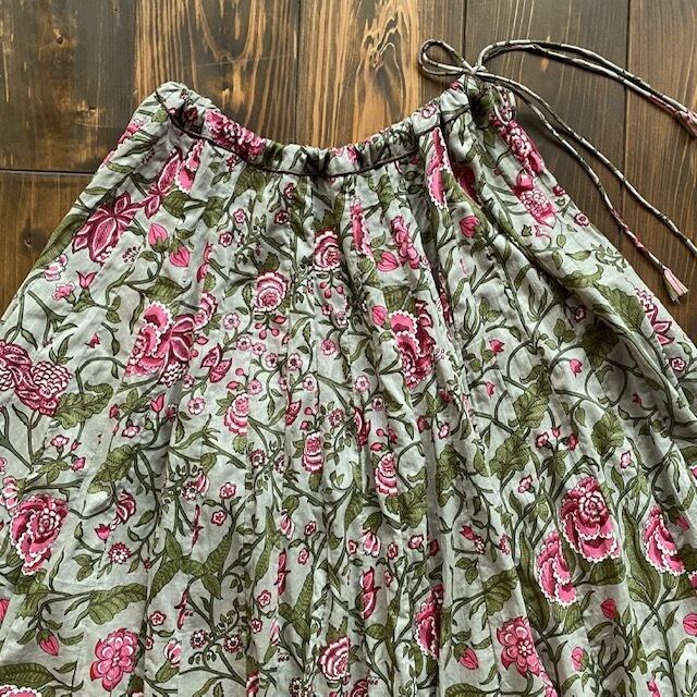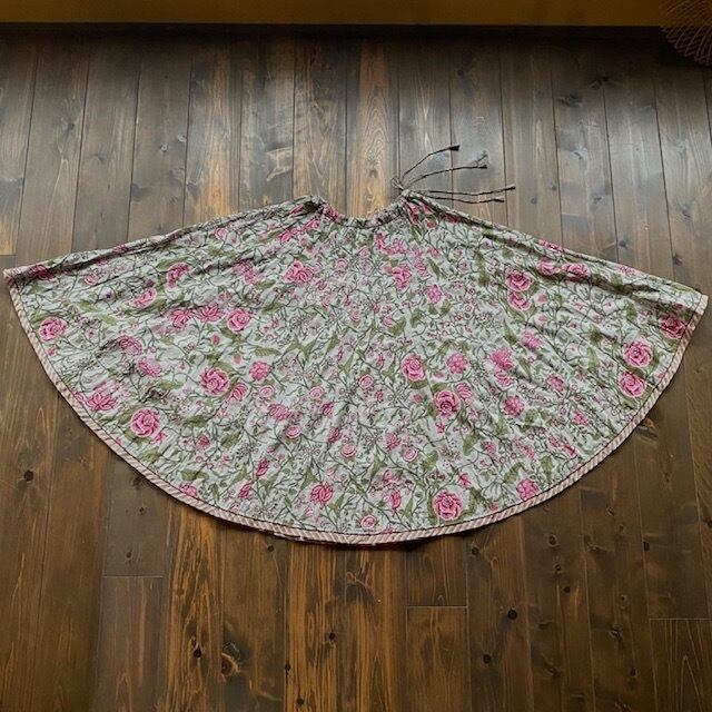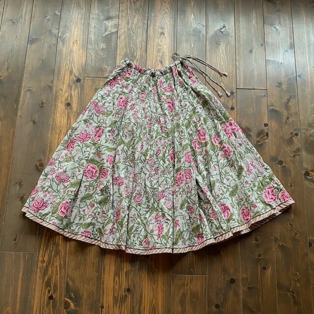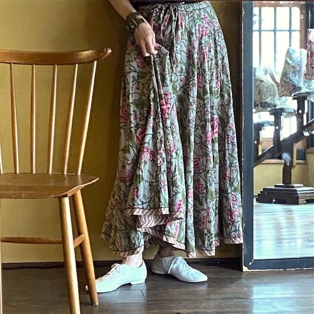 ブロックプリント生地を50枚はぎ合わせたドラマチックなフルサークルスカートです。