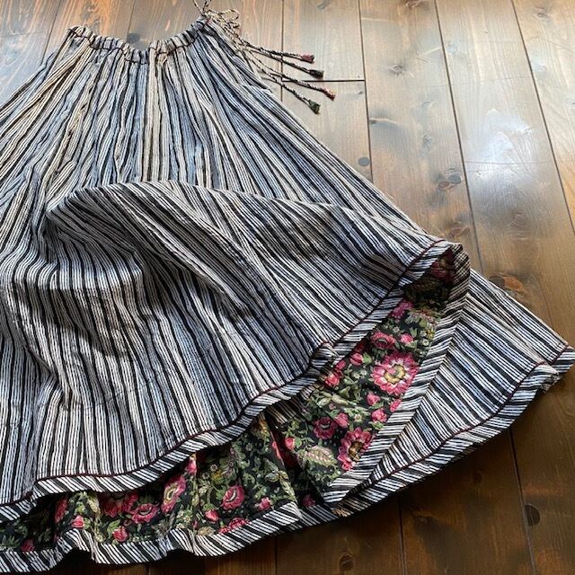 ブロックプリント生地を50枚はぎ合わせたドラマチックなフルサークルスカートです。