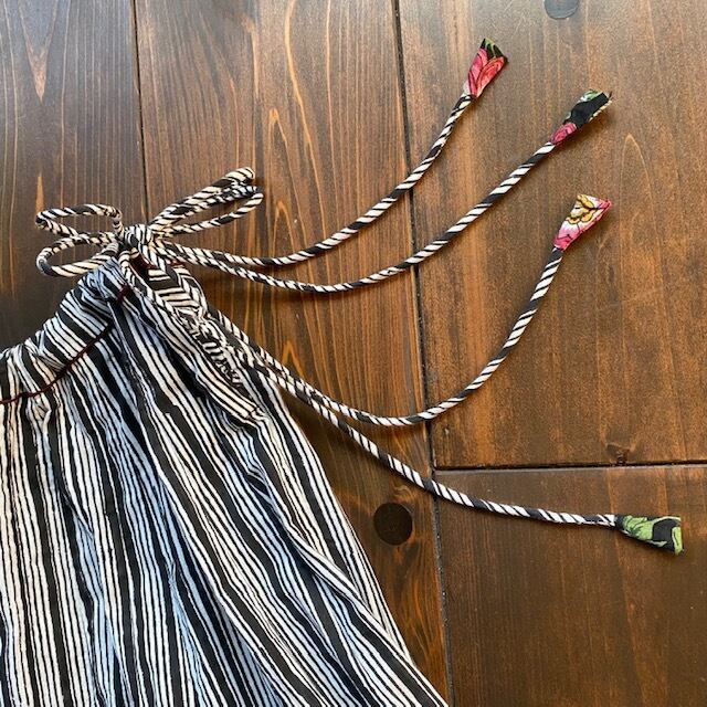 ウエスト脇はくるみボタンを留めていただいたうえ、ヒモで結ぶデザインとなっています。