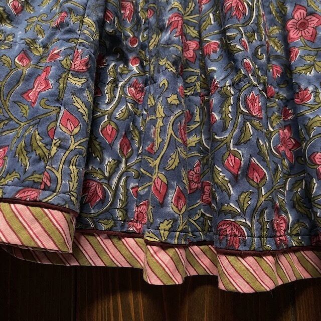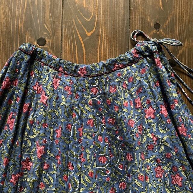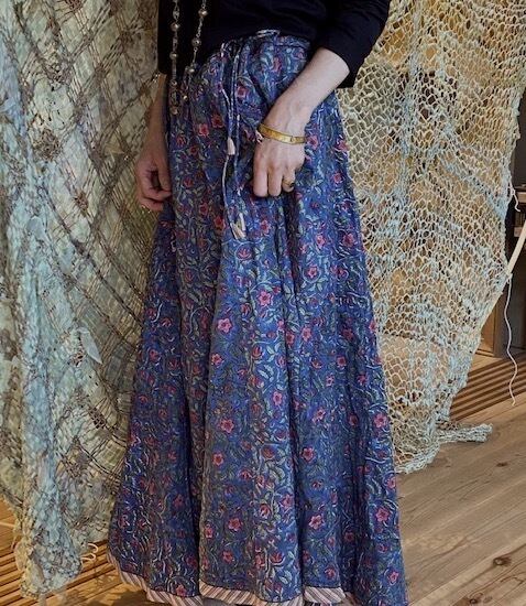 ブロックプリント生地を50枚はぎ合わせたドラマチックなフルサークルスカートです。