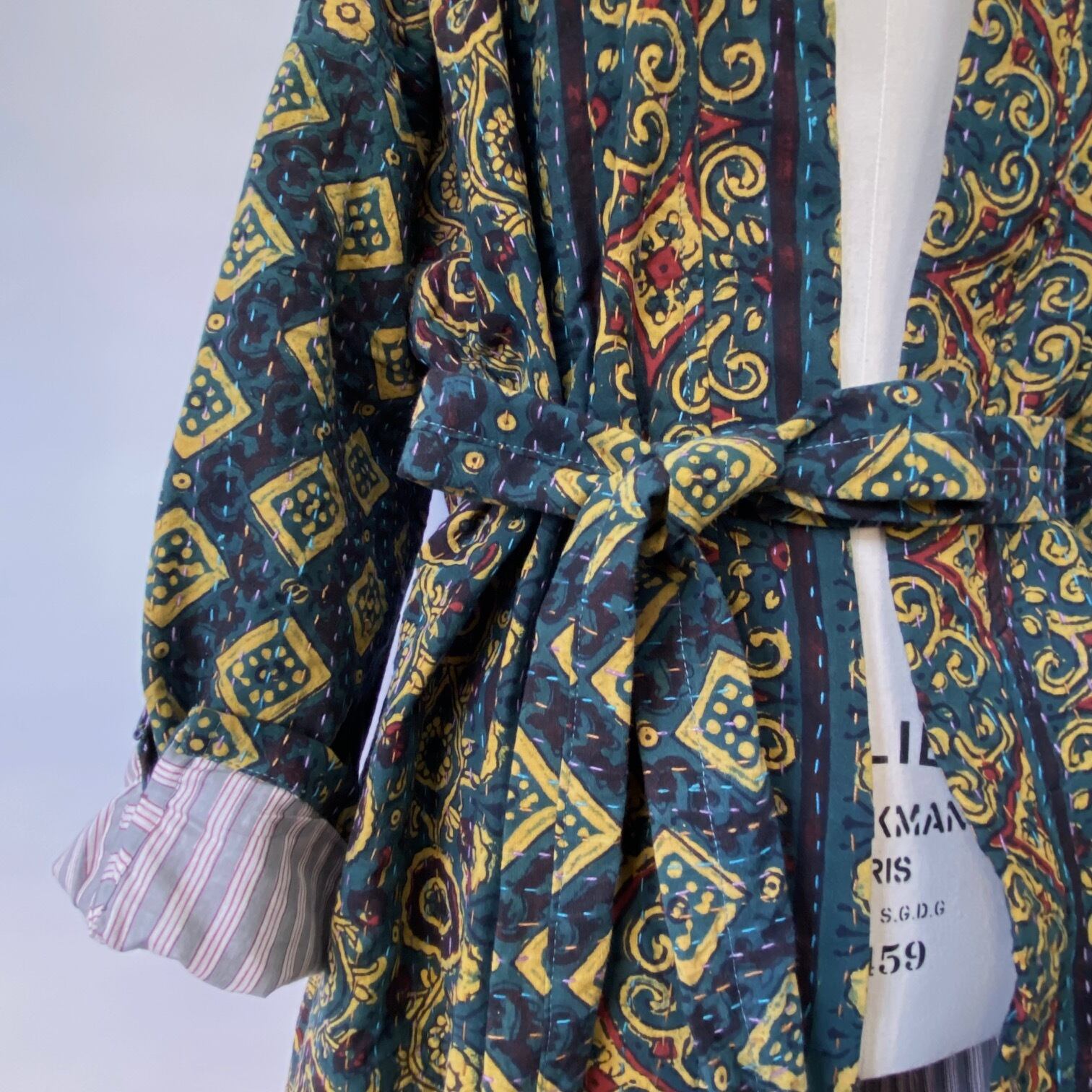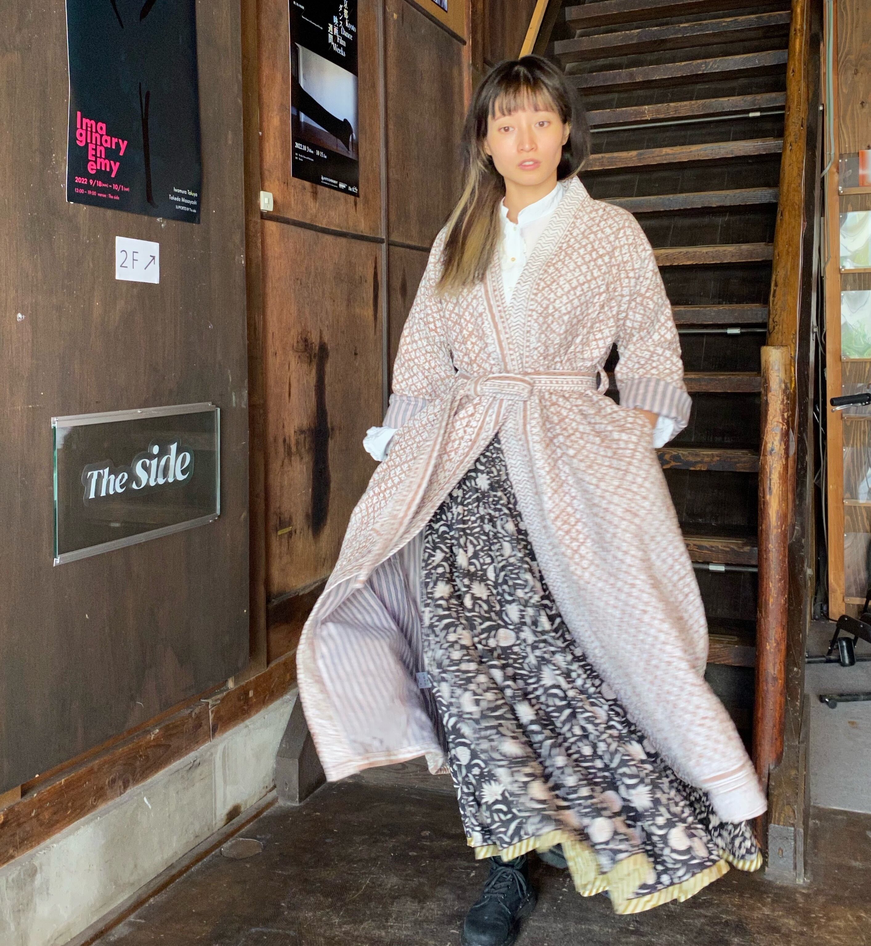 裏地にはブロックプリントのストライプきじを使用・・袖口に少しスリットが入っていたり・・付属のベルト(ベルトループが2か所についています)でウエストをマークしてみたり・・色々な小技が効くデザインとなっています。