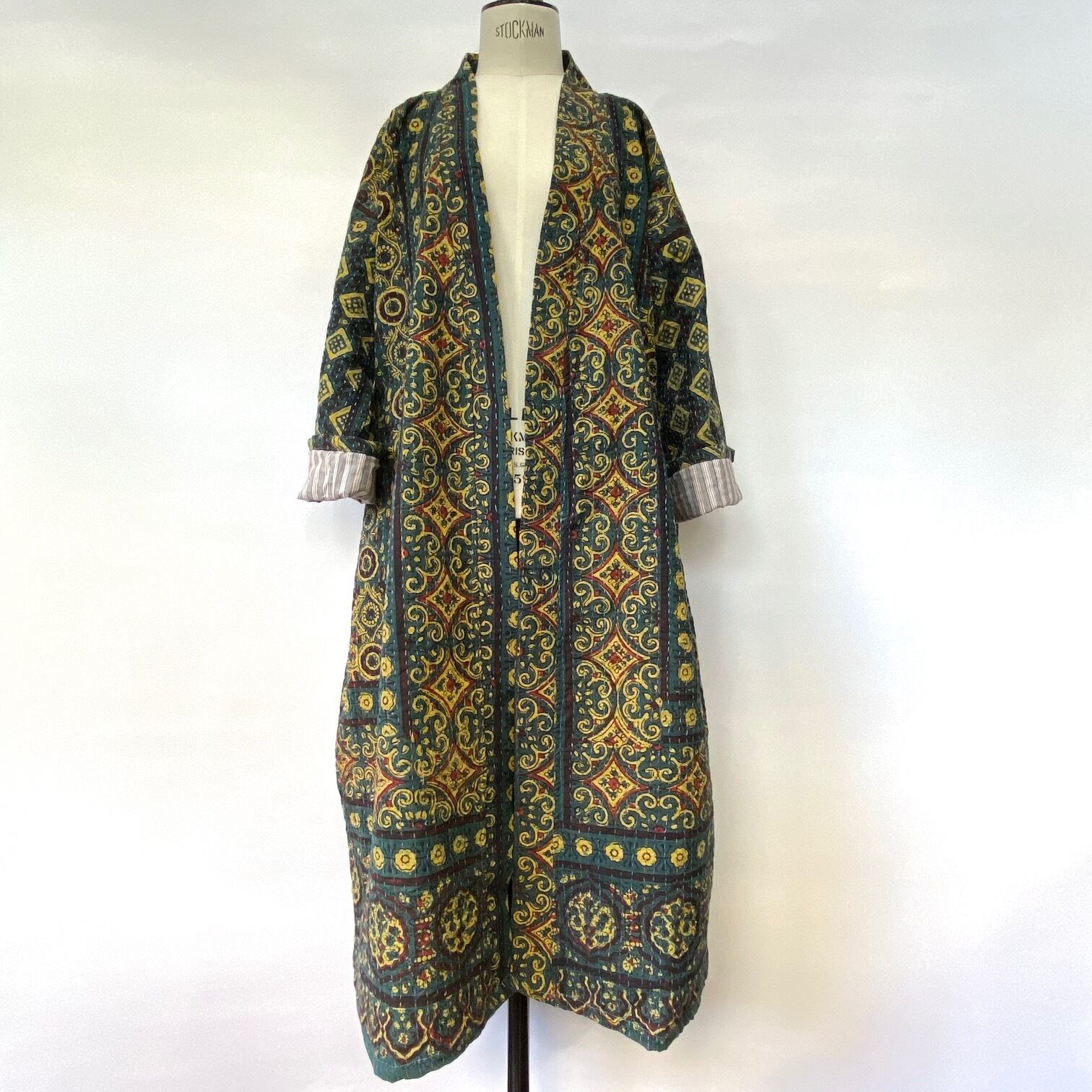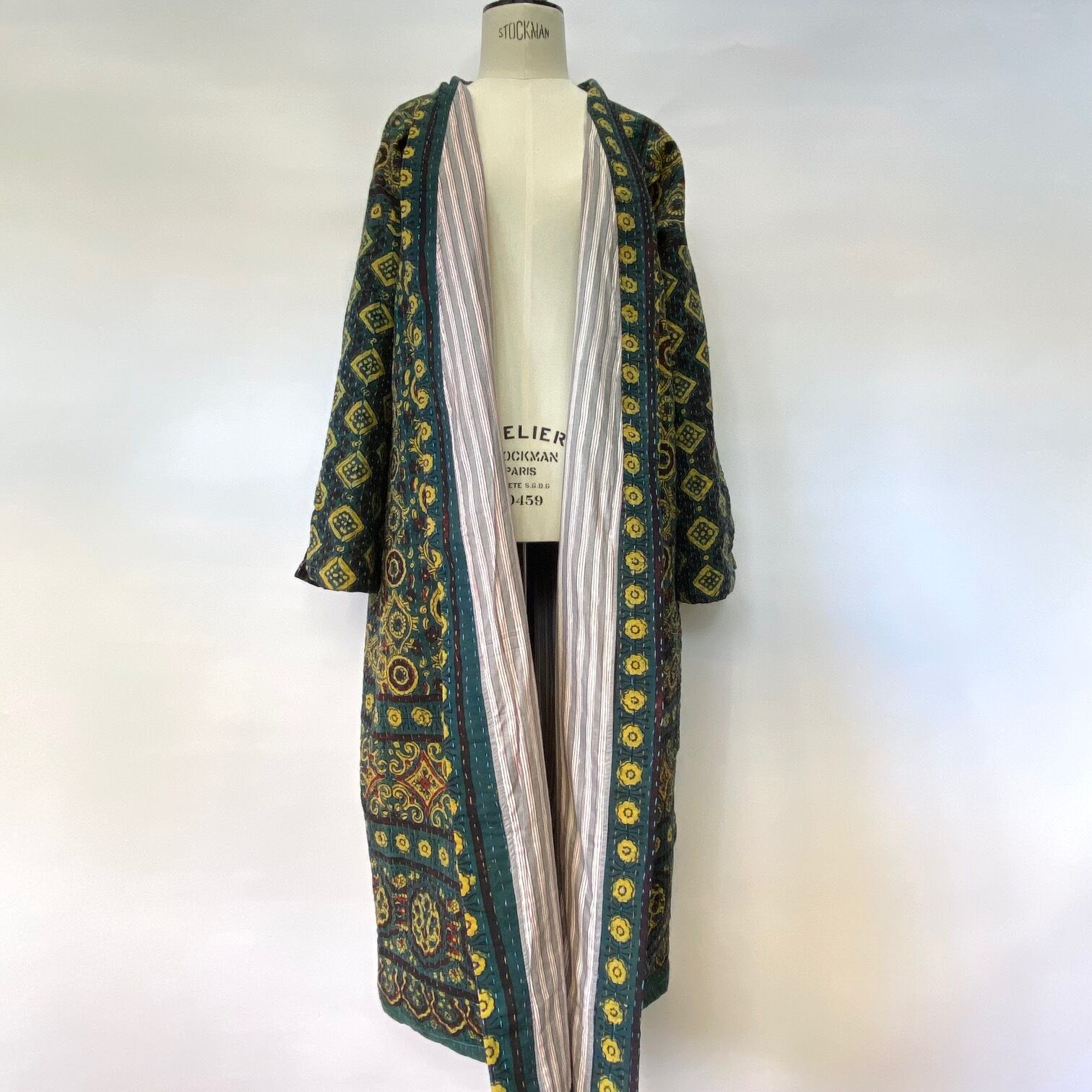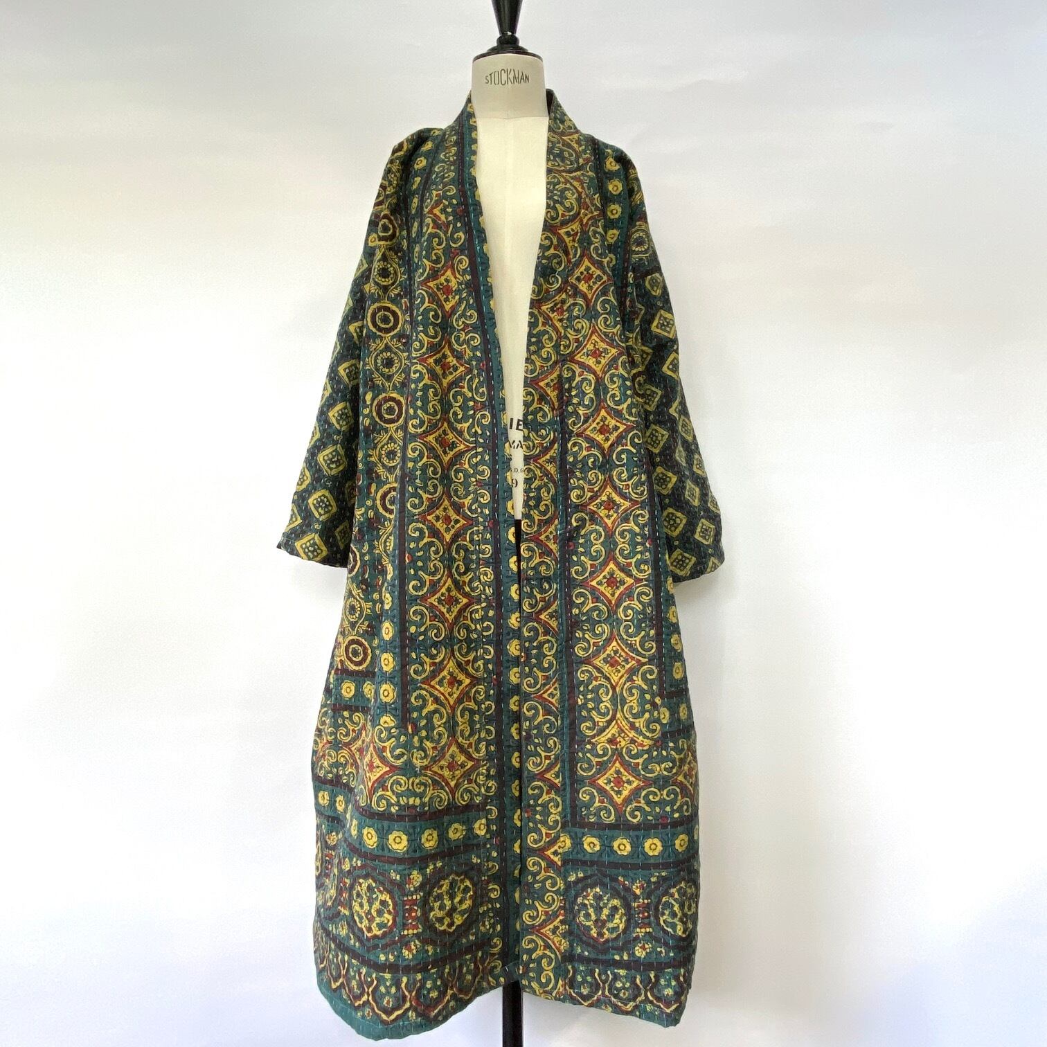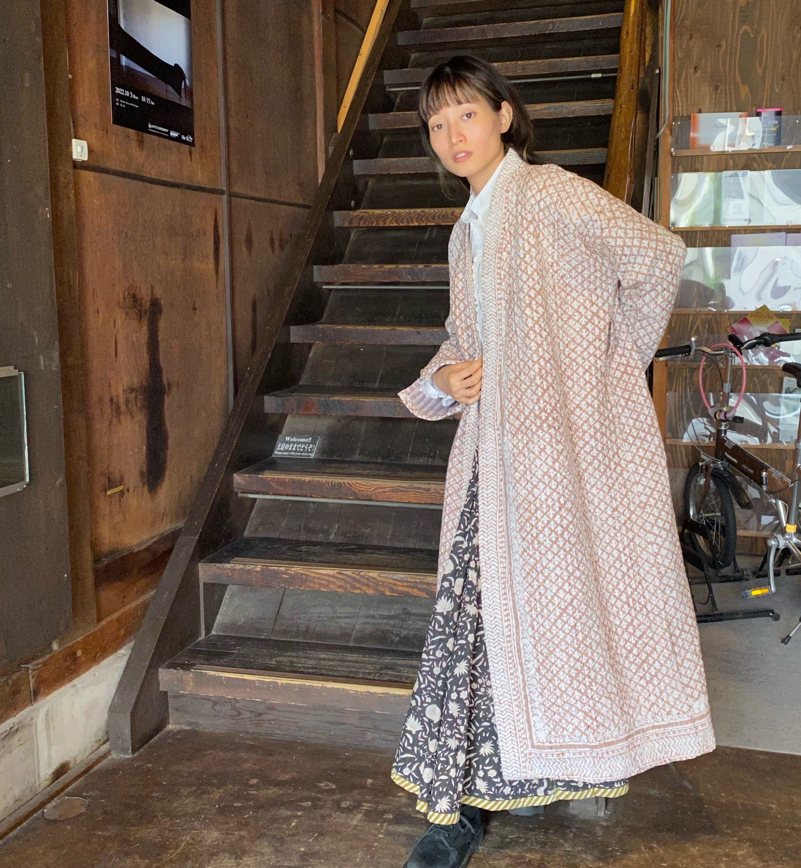 インド西部の伝統的なアジュラックのハンドプリント生地から仕立てた、前縦のストレートラインが美しいコートです。