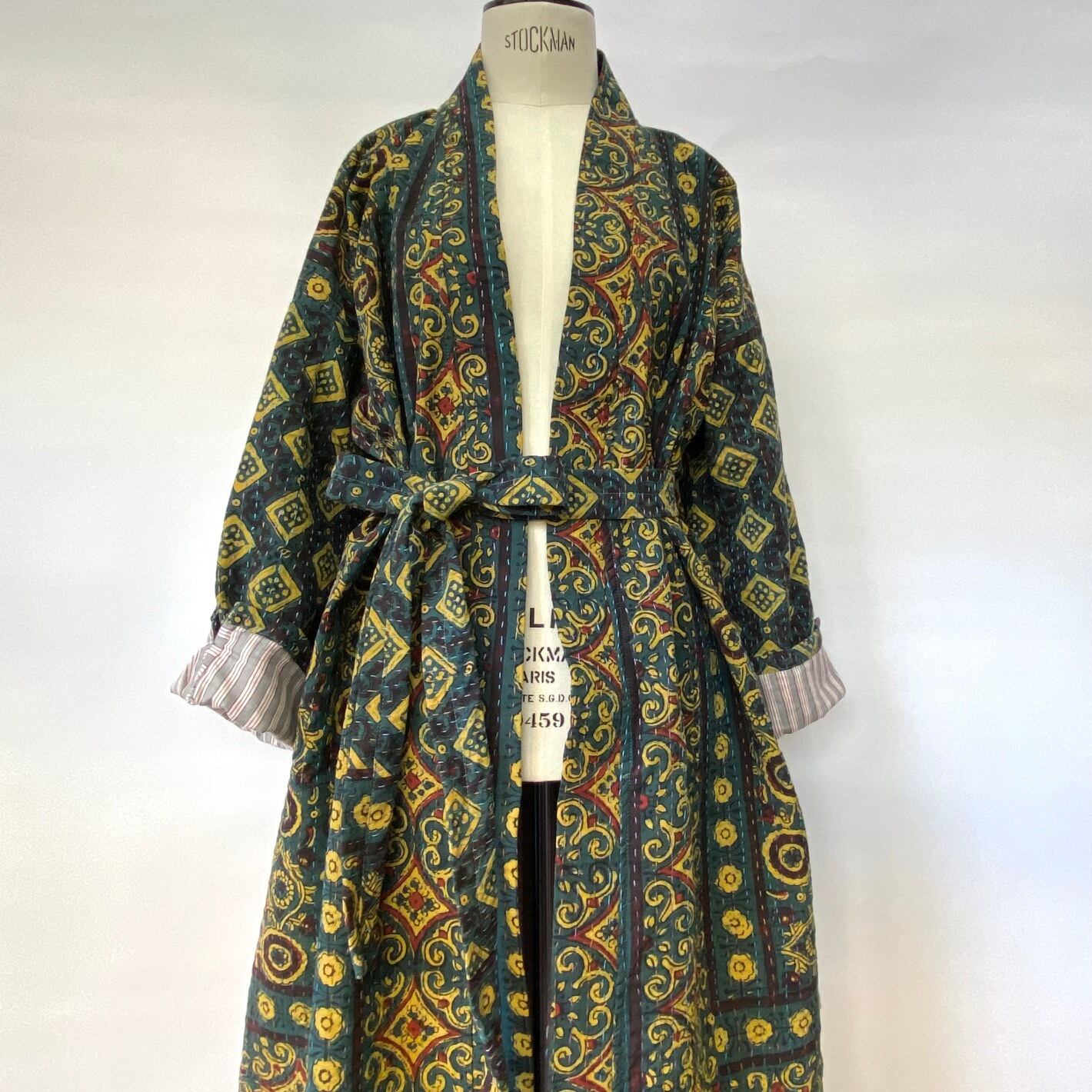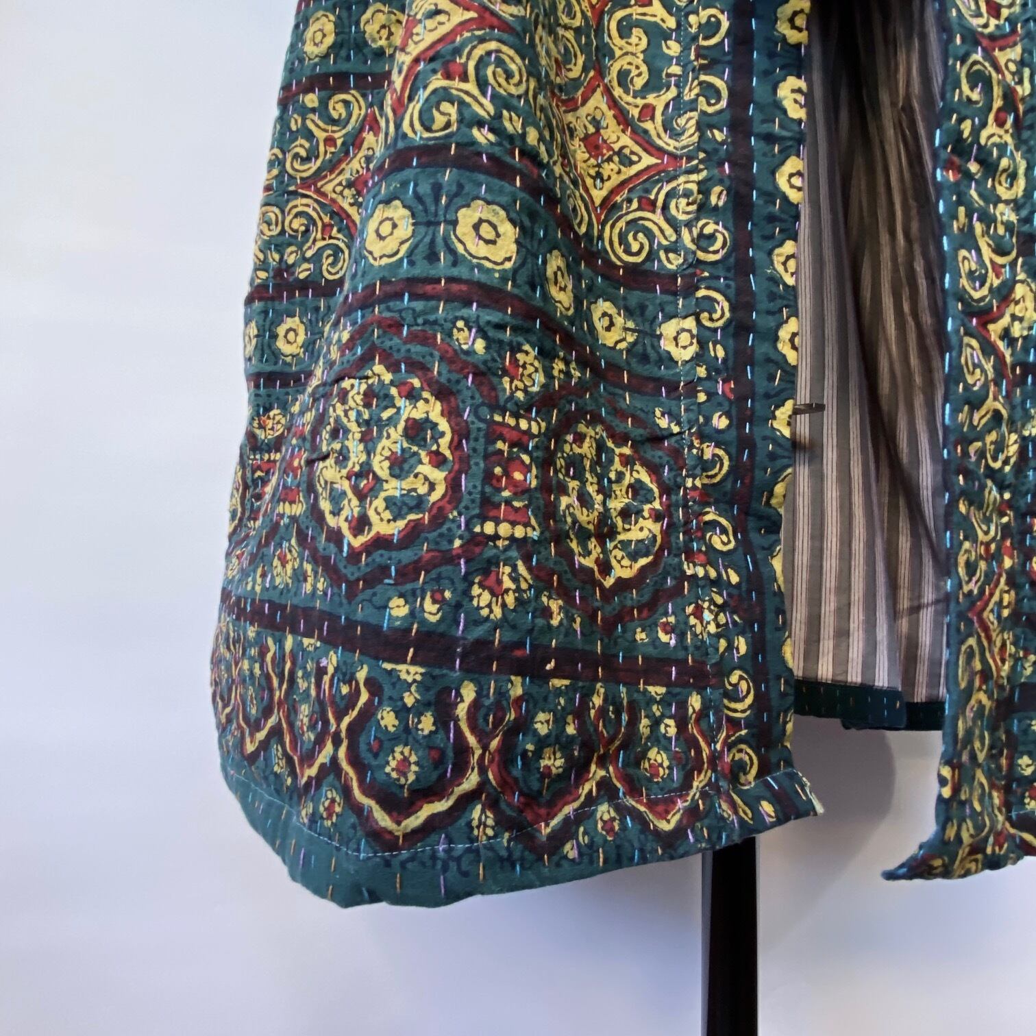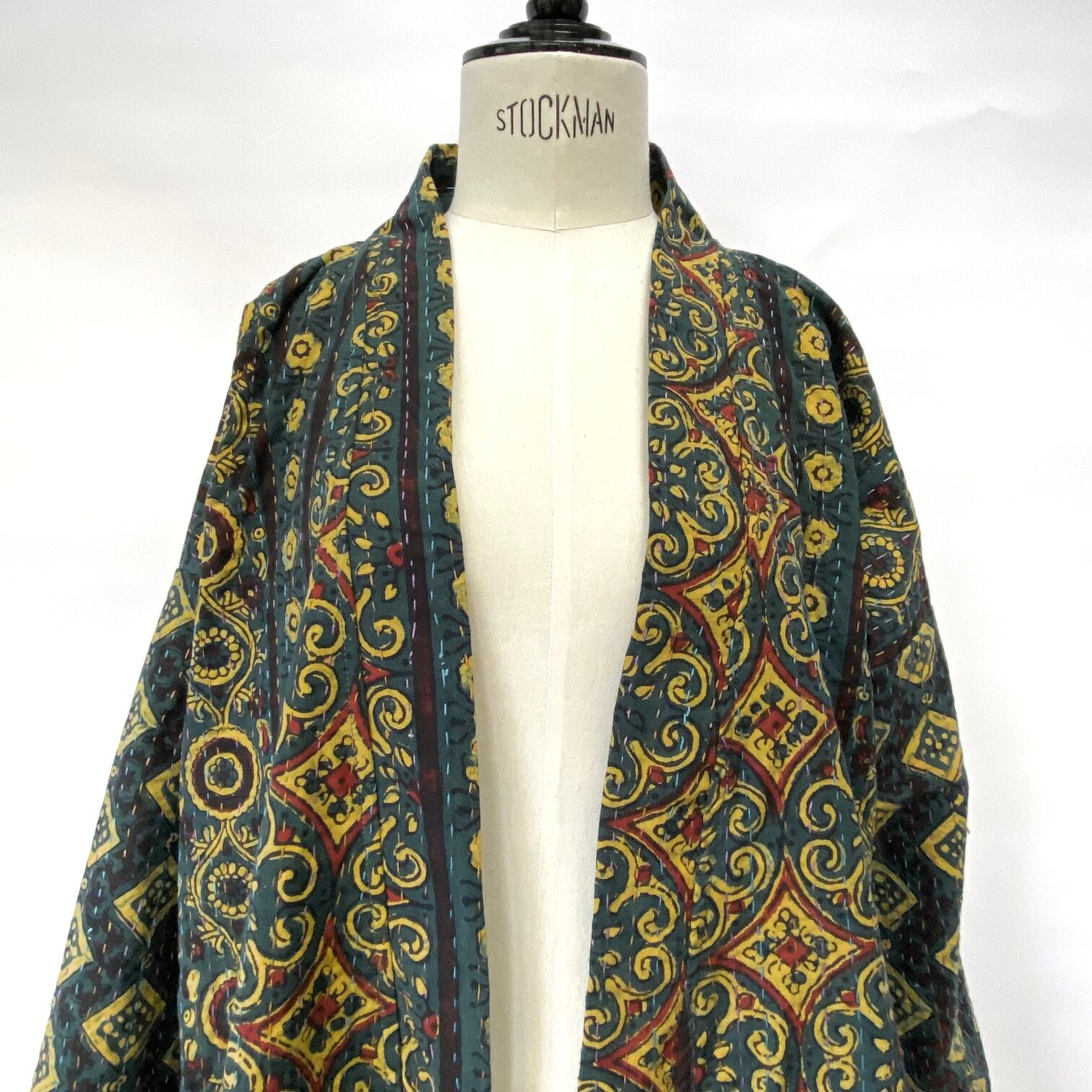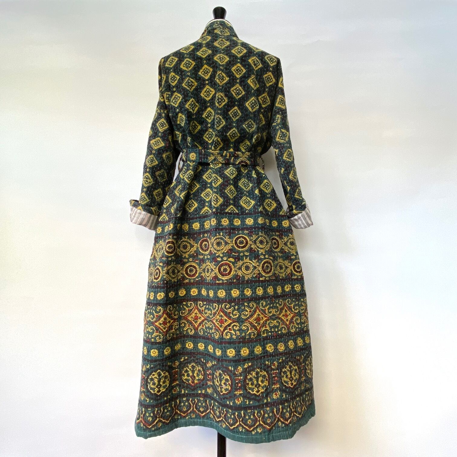 インド西部の伝統的なアジュラックのハンドプリント生地から仕立てた、前縦のストレートラインが美しいコートです。