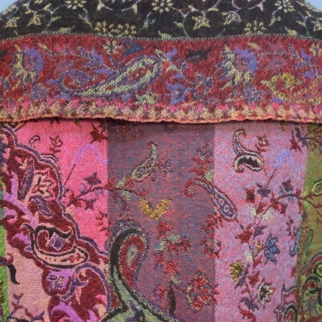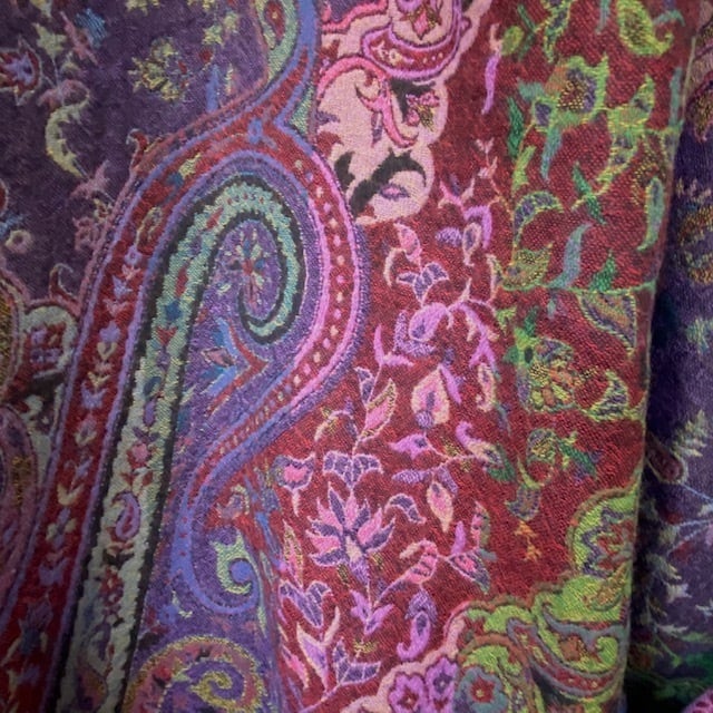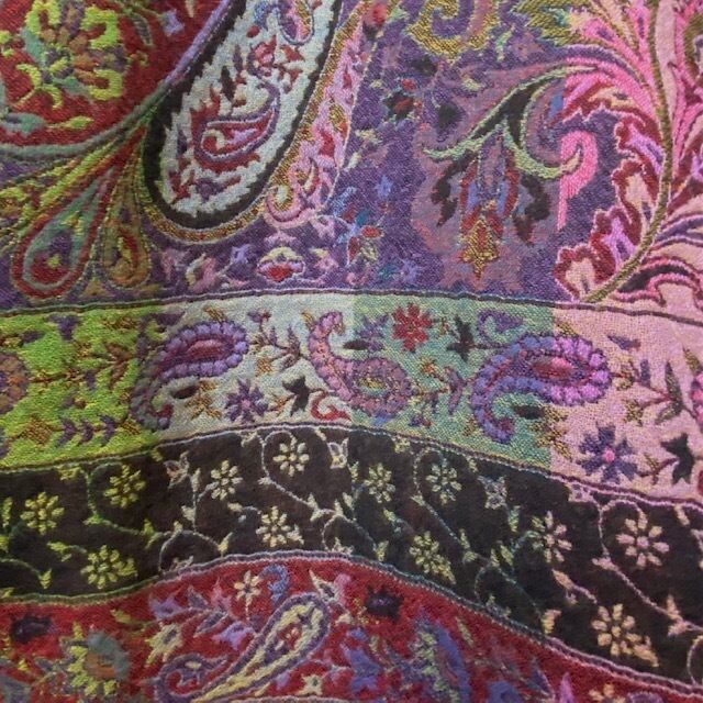 伝統的なペイズリーや優美な植物紋様が全面にあしらわれ、細密なタペストリーやステンドグラスを思わせるようなお品です。また色彩もとても美しいです。