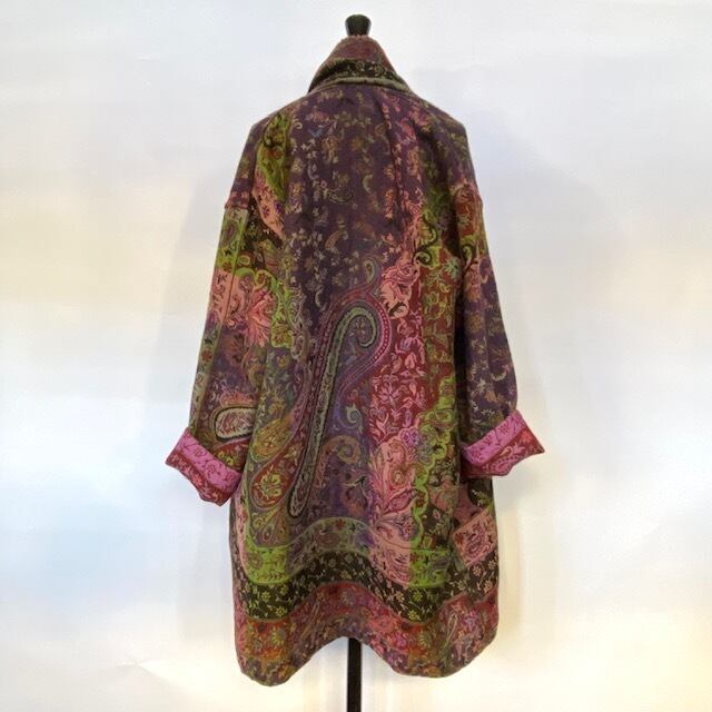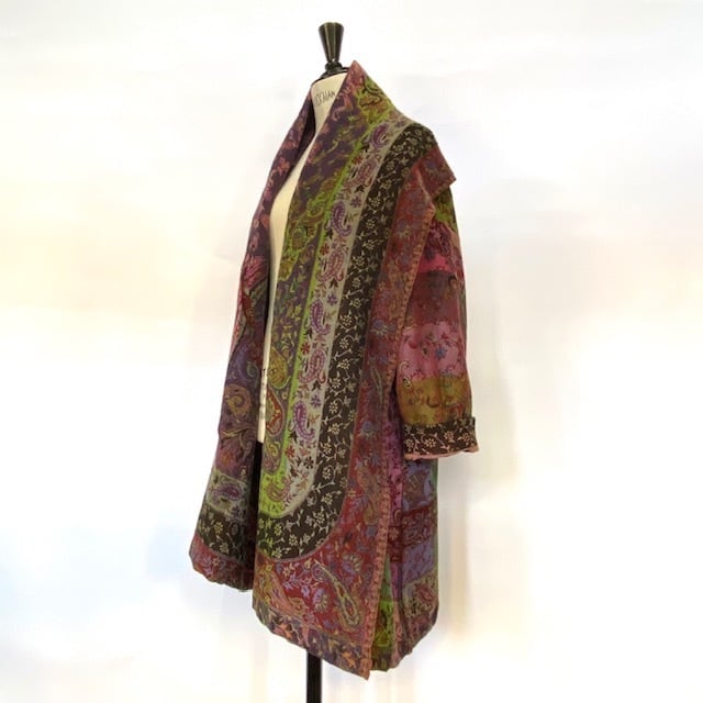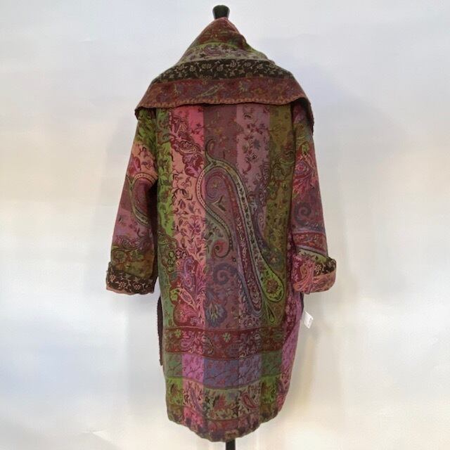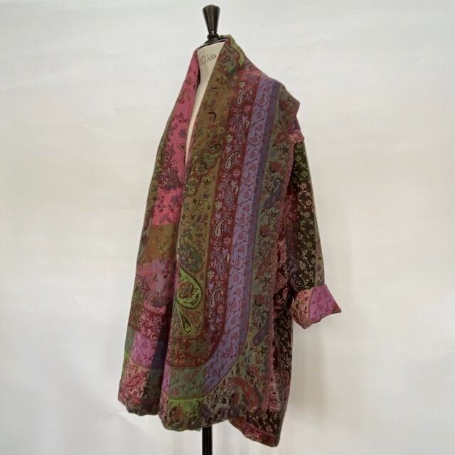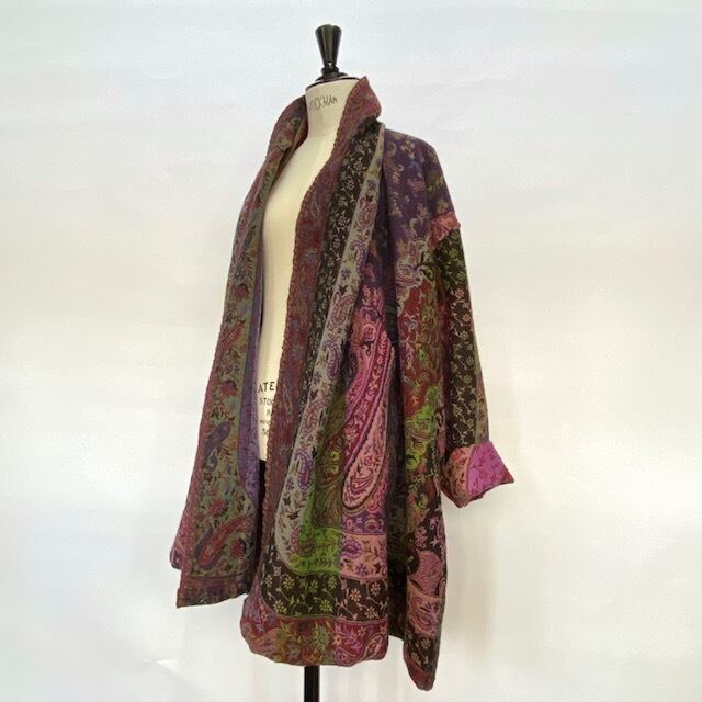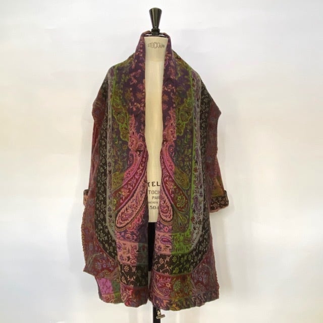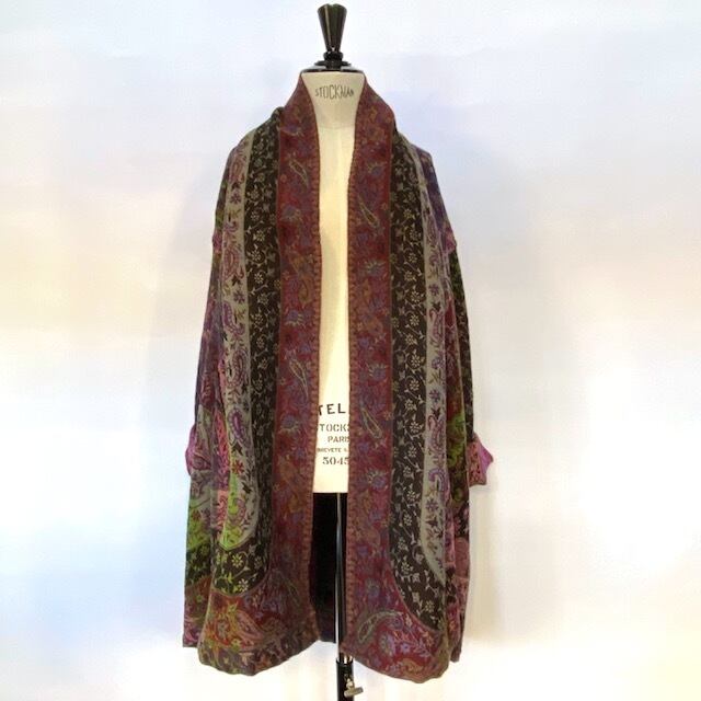 インド北部の山岳地方、カシミールにて織られた大判のウールストールを余すことなく使い仕立てられたドレープ感が素敵なカーディガンコートです。