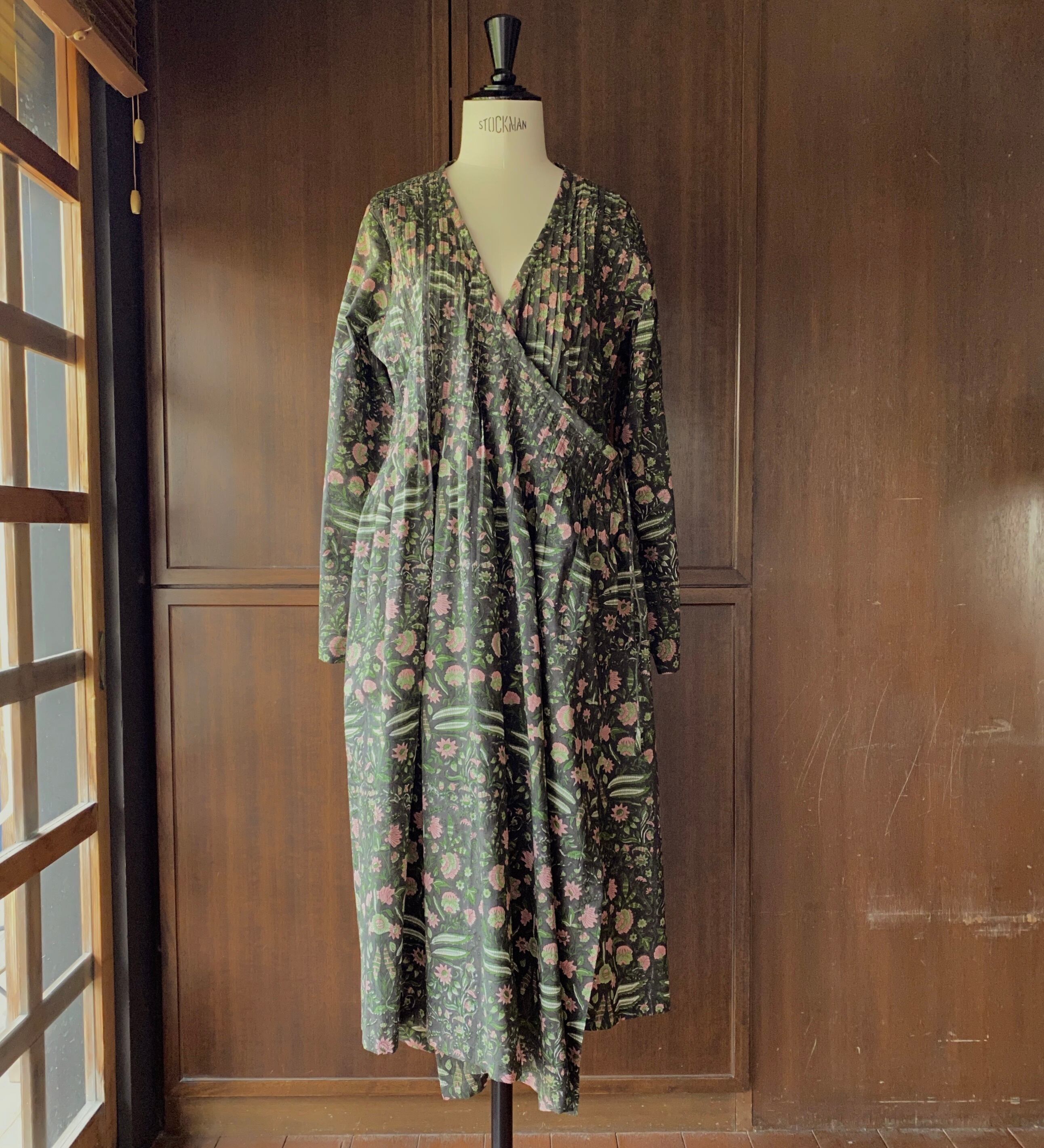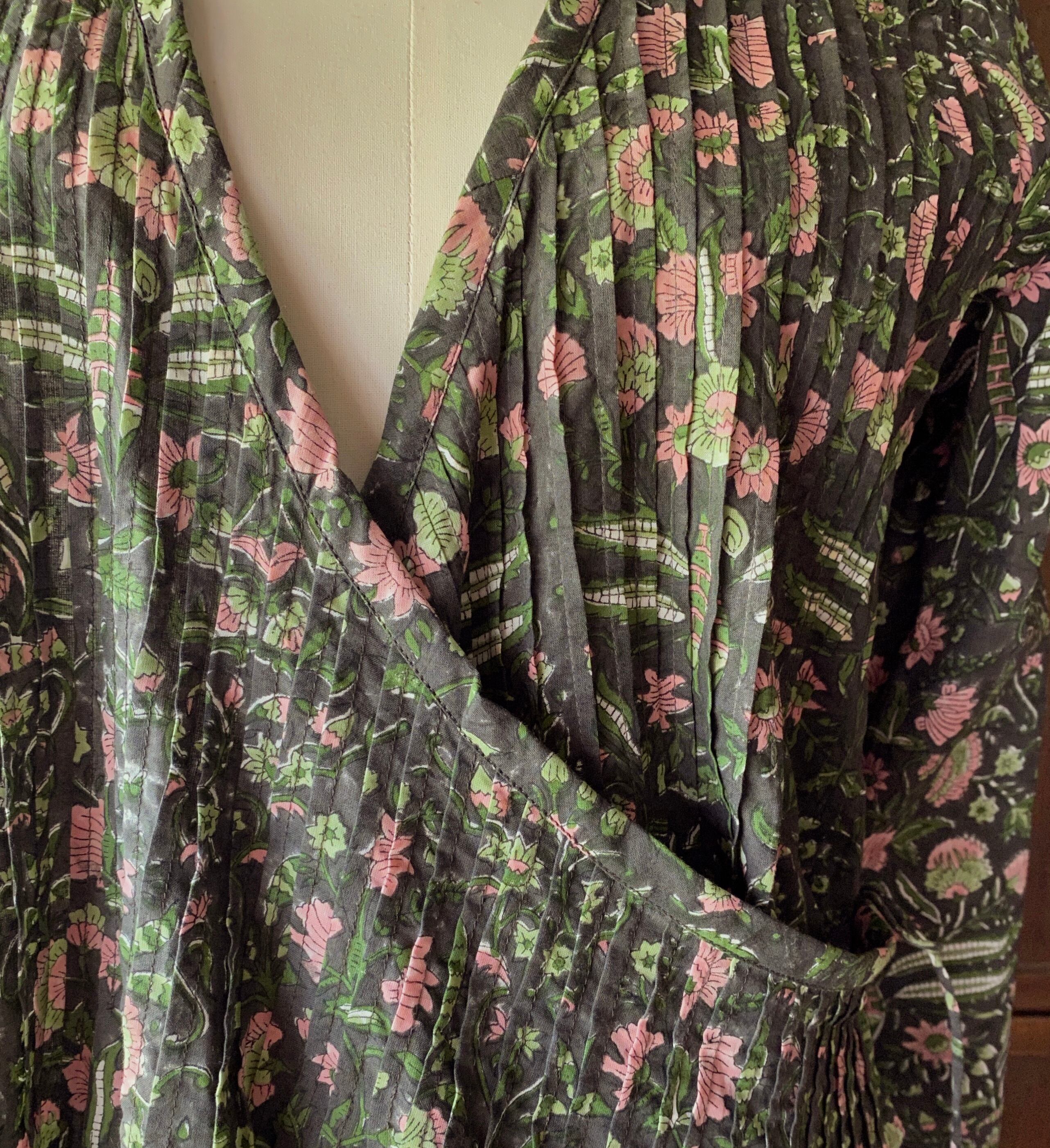 インドラジャスターン地方の伝統的なスタイル、ピンタックを前身頃にたっぷり取ったブロックプリントのカシュクールタイプのドレスです。