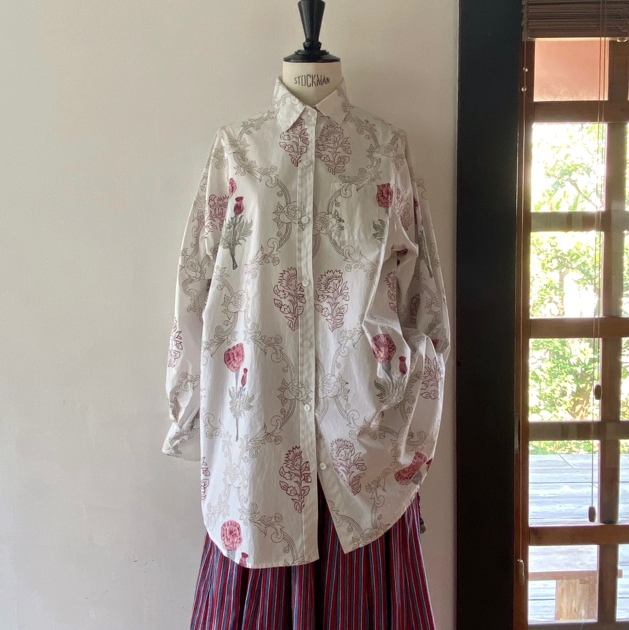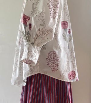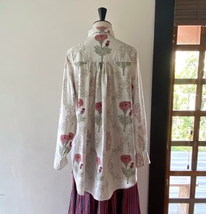 ハリ感のあるブロックプリント生地から仕立てられたシャツです。